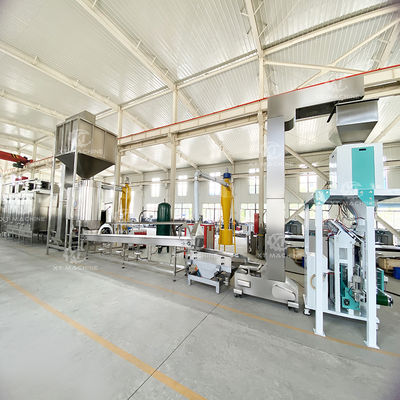 Toda la línea de producción incluye un tostador de cinta continuo, silo, máquina peladora de maní, clasificador de color y máquina envasadora. En comparación con las líneas de producción tradicionales, esta línea utiliza una máquina peladora de maní por flujo de aire en lugar de una máquina peladora de rodillo de esmeril.