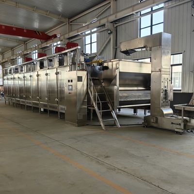 The Continuous nut roaster has been designed in order to meet all the remarkable requirements existing in the dry fruit/nut roasting. In fact the roaster is particular suitable for a wide range of products such as peanuts, hazelnuts, almonds, pistachios, cashews, sunflower seeds, sweet potato and so on. The stainless steel construction allows also the processing of wet and salted products. The roasting is carried out by forced air process and this permits to obtain a plain and homogeneous product. The roaster is divided in three different sections, including feeding section, roasting section and cooling section.