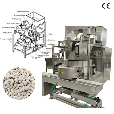 El sistema cuenta con una tolva de suministro de producto base con puerta corredera controlada neumáticamente que entrega el producto a la balanza de pesaje controlada por PLC.Los lotes medidos con precisión se introducen en la cámara de recubrimiento donde la rotación lleva el producto base a la pared de la cámara.